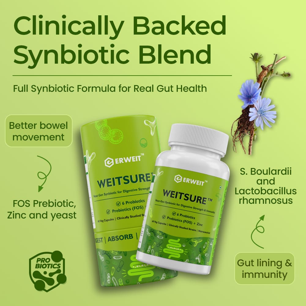 WEITSURE™ is a next-generation synbiotic formula combining prebiotics, 6 clinically relevant probiotic strains, yeast probiotic, and immune-supportive zinc for complete gut, immune, and digestive health.